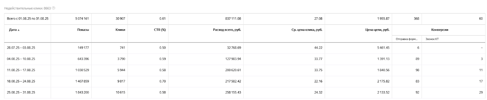 Рекламные кампании работали всё лето, цена лида была в районе 3000 р., но в конце июля удалось снизить стоимость до 2700 р. Решили, что пора масштабироваться, потому что нашли рабочую связку. Клиент предложил за август выйти на 1 млн. и поставил KPI - цена лида не выше 2500р.